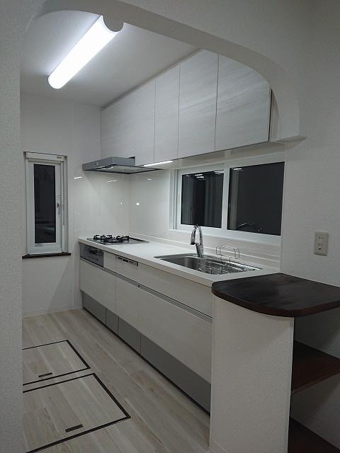 買主様のご希望でキッチンをお取替え。2面の窓から採光を取り入れ、壁に合わせ面材も白色で!