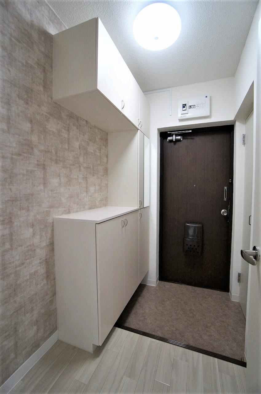 玄関はたくさんのお客様が来られるところ。下駄箱の壁面は1000#のクロスで豪華さを!
