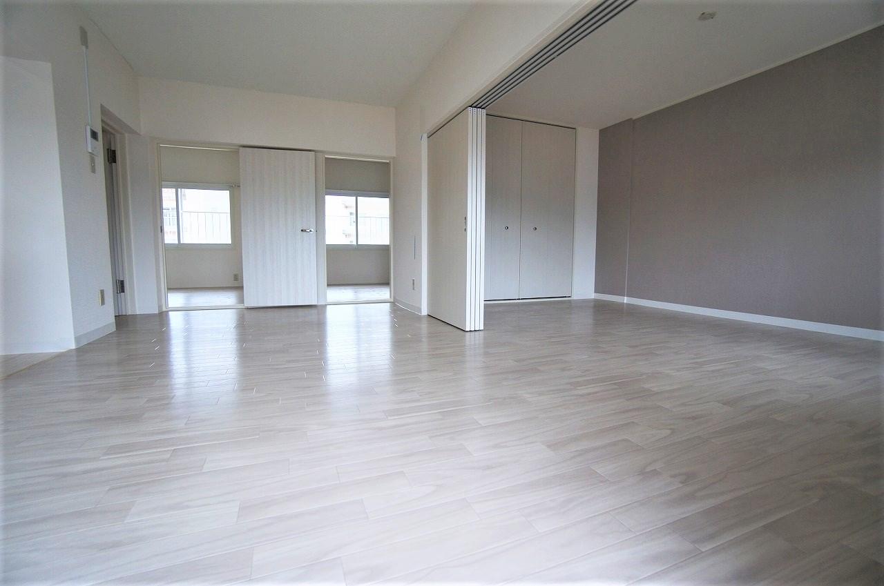 洋室3室は全てリビングインタイプ。お部屋の面積が居室に生かされているプランでしす。4枚引戸は白色でしたので、洋室2・3の建具も白で統一