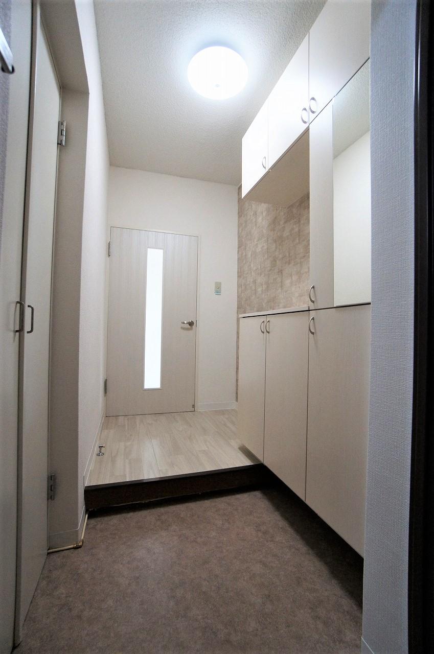 玄関はたくさんのお客様が来られるところ。下駄箱の壁面は1000#のクロスで豪華さを!