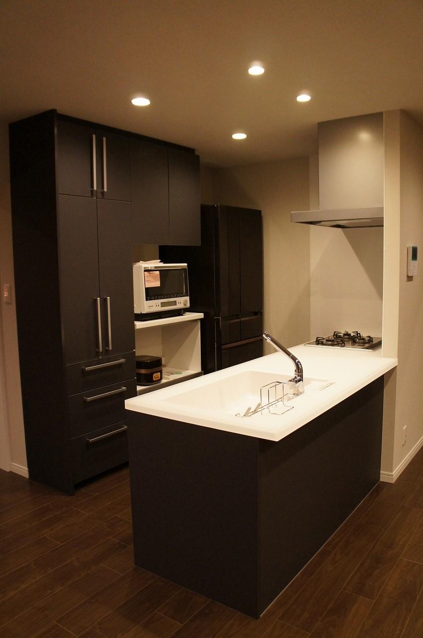 キッチンの天板を少し奥行のあるものにしました。キッチン裏の食器棚も造作で取付。