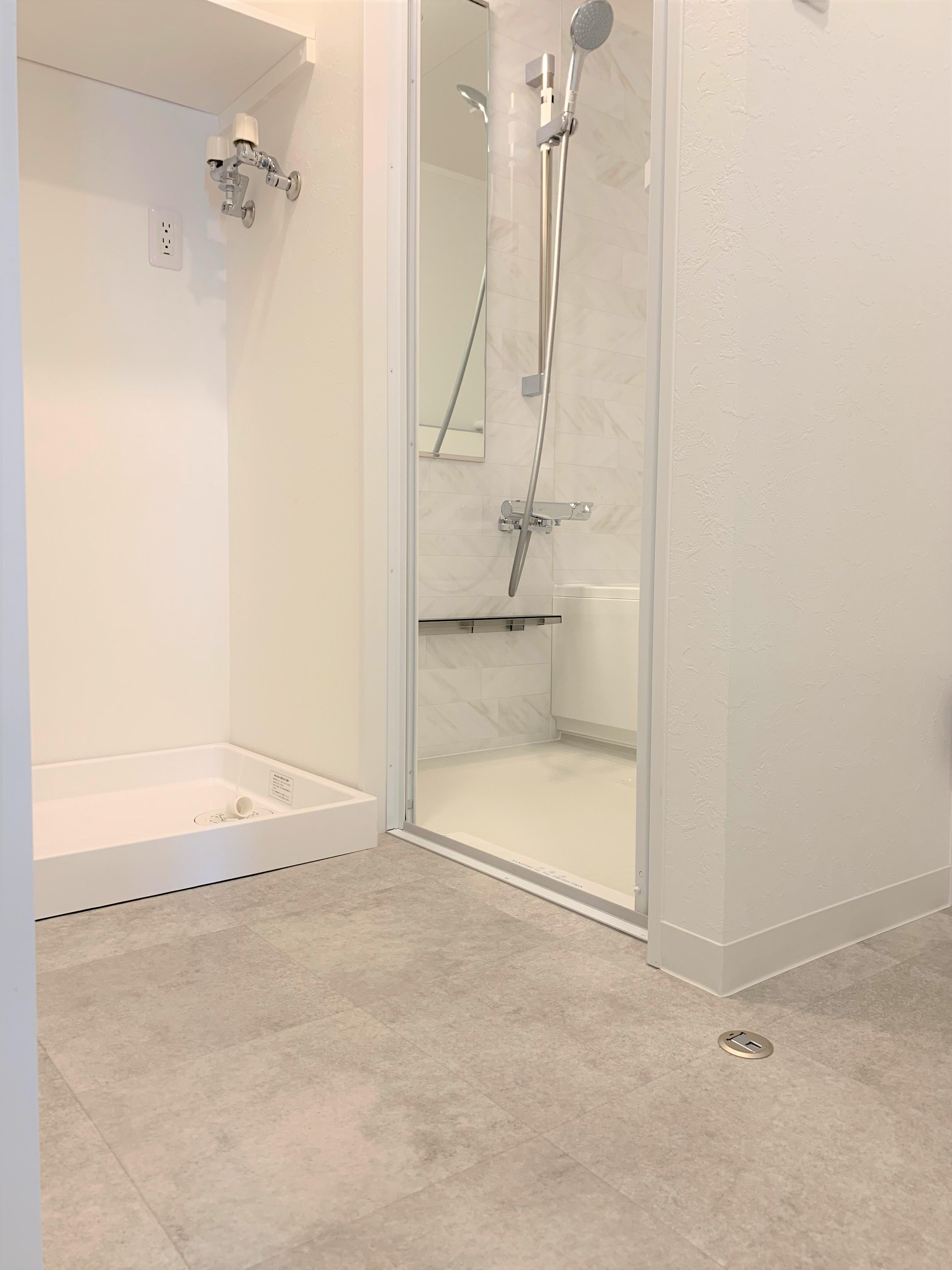 脱衣所とバスルームの段差もフラットにしました。